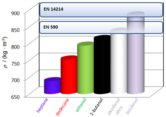 Comparison of the density at 288.15 K of heptane [36,37], dodecane [38], ethanol [36,37], 1-butanol (this work), ekodiesel ultra [12], biodiesel [12] with norm EN 590 for diesel and EN 14214 for biodiesel.