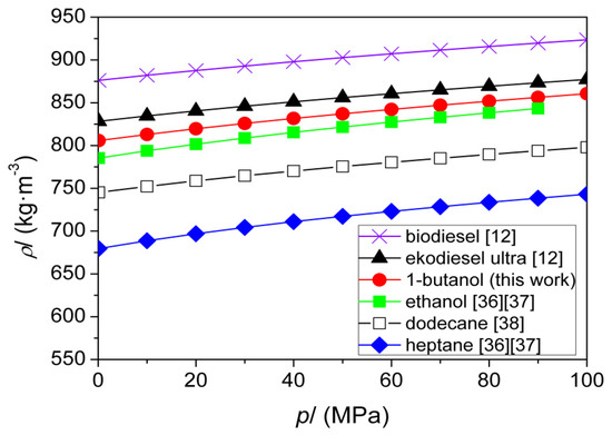 The density, isentropic compressibility and isobaric thermal expansion of 1-butanol were compared with density, isentropic compressibility and isobaric thermal expansion of heptane [36,37], ethanol [36,37], dodecane [38], diesel oil (ekodiesel ultra) [12] and biodiesel [12]. Heptane and dodecane are components of the fuels [36,37,38]. The engine simulations were carried out first using heptane and then dodecane as a more suitable “low or no sulphur”, “ideal” surrogate component for petrodiesel fuels [39,40]. Moreover, the thermophysical properties of dodecane are similar to the thermophysical properties of aviation kerosene [41]. For comparison, ethanol was also chosen as the most commonly used bioalcohol. Additionally, the properties of 1-butanol were compared with those of petrodiesel oil with sulfur content < 10 mg/kg which fulfilled norm EN 590 [12] (named ekodiesel ultra) and biodiesel composed of fatty acid methyl esters from rapeseed oil, which fulfilled norm EN 14214 [12]. Among studied fuel components, the density of 1-butanol at 288.15 K is the closest to norm EN 590 for diesel and the most similar to the density of diesel oil ekodiesel ultra (see Figure 12). Moreover, the differences between the density of 1-butanol and ekodiesel ultra decrease with increasing pressure from 2.8% at 0.1 MPa to 1.9% at 100 MPa and at 298.15 K (see Figure 13).