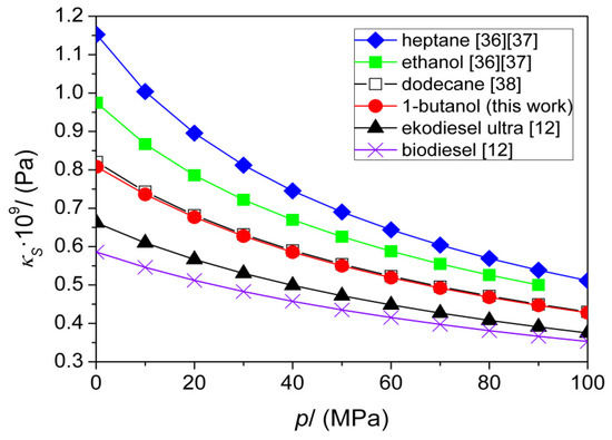 The 1-butanol is less compressible than heptane by 43 ÷ 20% in the pressure range of 0.1 ÷ 100 MPa, and ethanol by 21 ÷ 12% in the pressure range of 0.1 ÷ 90 MPa at 298.15 K. The 1-butanol is more compressible than diesel by 18 ÷ 12% and biodiesel by 28 ÷ 17% in the pressure range of 0.1 ÷ 100 MPa at 298.15 K. On the other hand, the compressibility of 1-butanol is close to dodecane, and furthermore, the differences between compressibility of 1-butanol and dodecane decrease with increasing pressure from 1.5% at 0.1 MPa to 0.5% at 100 MPa and at 298.15 K (Figure 14).