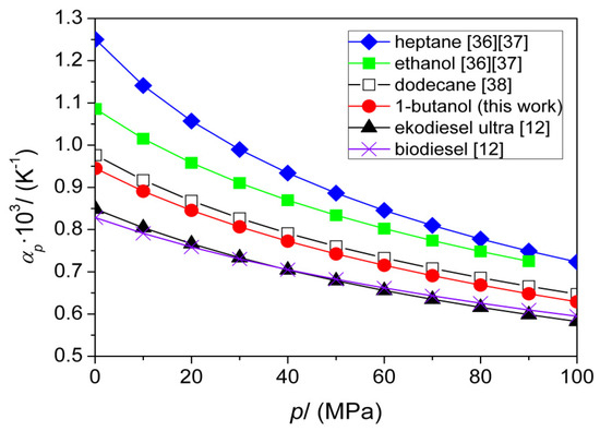 As in the case of isentropic compressibility, the isobaric thermal expansion of 1-butanol is lower than those of heptane by 32 ÷ 15% in the pressure range of 0.1 ÷ 100 MPa, and ethanol 15 ÷ 12% in the pressure range of 0.1 ÷ 90 MPa at 298.15 K. The isobaric thermal expansion of 1-butanol is higher than those of diesel by 10 ÷ 7% and biodiesel by 12 ÷ 5% in the pressure range of 0.1 ÷ 100 MPa at 298.15 K. On the other hand, isobaric thermal expansion of 1-butanol is the most similar to dodecane and likewise, the pressure dependence of isobaric thermal expansion of 1-butanol is the most similar to the pressure dependence of isobaric thermal expansion of dodecane (Figure 15). The differences between the expansivity of 1-butanol and dodecane slightly decrease with increasing pressure from 3.3% at 0.1 MPa to 2.9% at 100 MPa and at 298.15 K.