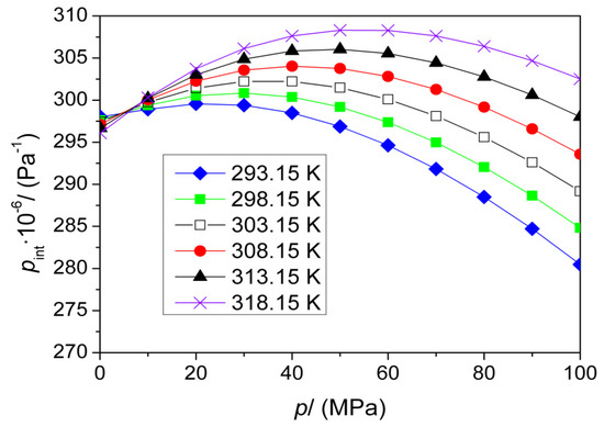 provided that Δp = p2 – p1 is small. The initial values of u(T, p0 = 0.101325 MPa), ρ(T, p0 = 0.101325 MPa), and cp(T, p0 = 0.101325 MPa) were used in the Equation (8). The specific isobaric heat capacity at p2 is acquired by: