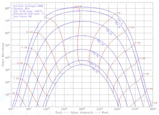 - University of Oregon–Solar Radiation Monitoring Laboratory: Sun Path Chart Program. Available online: http://solardat.uoregon.edu/SunChartProgram.html (accessed on 14 September 2020).