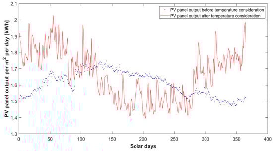 - The PV generation data are generated through the irradiance in the region. After temperature compensation is carried out for the panels, as described in Section 4.1, the panel output is obtained by multiplying the efficiency of the panel (22.1%, according to the data sheet in [24,25]). This obtained output is for per m2 of the panel. The final PV generation is obtained by multiplying the obtained per m2 value with the available rooftop area.
