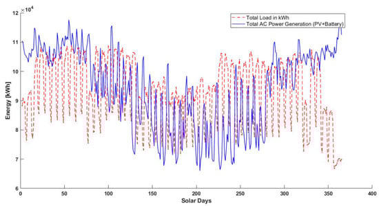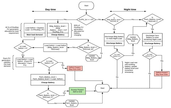 - The battery capacities chosen according to the sizing considerations are 12,000 kWh for the buildings and 35,000 kWh for the PV farm. These considerations are obtained through varying several values for the batteries in the given flowchart in Figure 8.