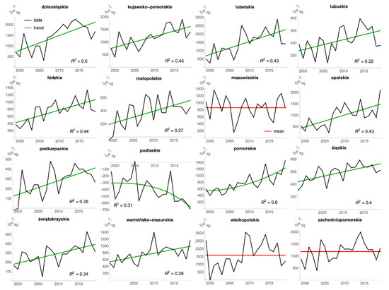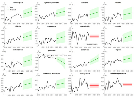 In the case of the Wielkopolskie voivodeship, the non-linear trend turned out to be unacceptable due to generated forecasts, while the linear trend did not have a significant parameter of the time variable. Therefore, it was considered that no trend model could be obtained in this case. For the Mazowieckie and Zachodniopomorskie voivodeships, no trend model with significant parameters could be estimated. Therefore, for these three voivodeships, instead of the trend model, a constant level of straw surplus (with an average value) was adopted for the entire period considered.