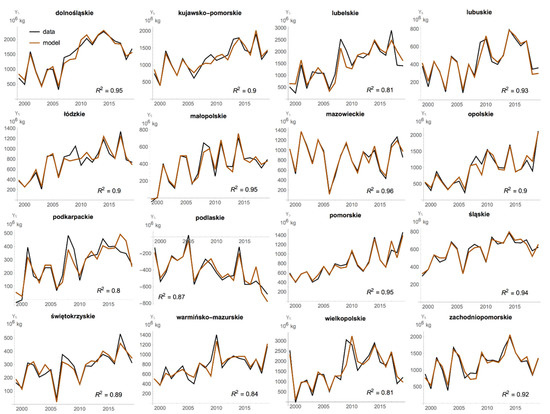 All received models contained at least two explanatory variables. The obtained models were very well fitted to the empirical data (Figure 2 and Table 4). The adjusted determination coefficients had values from 0.80 to 0.96, which means that the models explained at least 80% of the changes in the surplus of straw by voivodeships in the examined period.