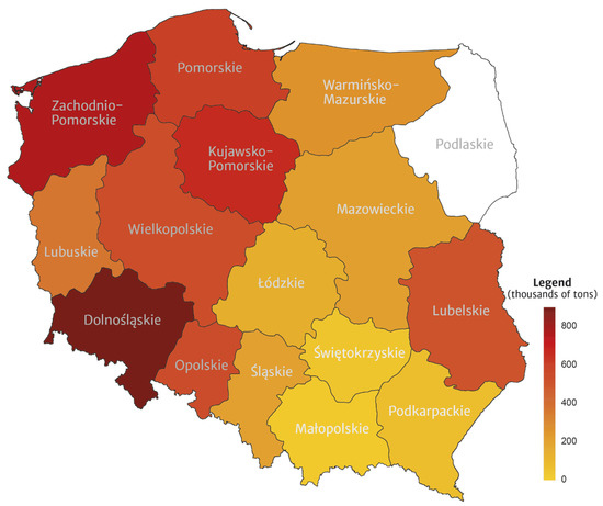 The amounts of straw surpluses vary regionally because they depend on the land use, the structure of crops, the size of farms, as well as the stocking density and method of raising livestock. The greatest possibilities for straw use for energy production purposes were characterized in the following voivodeships: Wielkopolskie, Kujawsko-Pomorskie, Lubelskie, Zachodniopomorskie, Dolnośląskie, and Mazowieckie. The results obtained are close to the estimates presented by other authors [46,47,48,49,50,51,52,53,56].