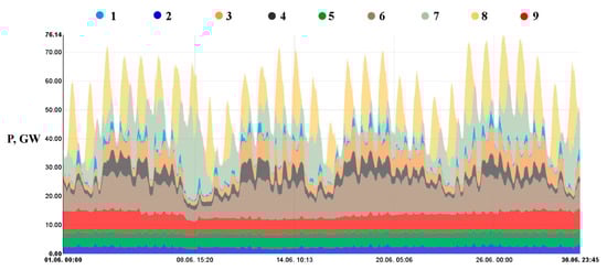 Generation of electric energy in the German electric power system, with division into sources, as of June 2019 (1—pumped-storage hydroelectric; 2—hydroelectric; 3—natural gas; 4—hard coal; 5—biomass; 6—lignite; 7—wind; 8—photovoltaic; 9—nuclear) [].