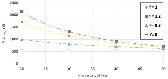 The required power of plasma torches as a function of the relative power of the assumed case of 200 MWel power unit, depending on the assumed Y coefficient.