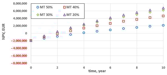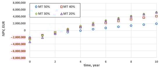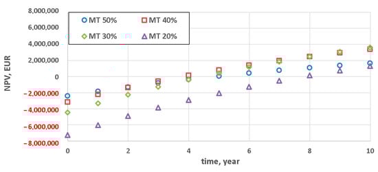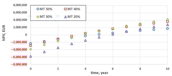At coefficient Y = 1 the results were slightly different (Figure 5), i.e., the least promising results were for the variant with the lowest technical minimum (MT 20%) and for the variant permitting a relatively small technical minimum reduction (MT 50%). In the case of MT 20%, because of the relatively high capital expenses (for Y = 1), this variant becomes profitable (NPV > 0) as late as after seven years. Variant MT 50%, despite the substantially lower capital expenditures, becomes profitable towards the end of the considered investment horizon (10 years). Also in the case of coefficient Y = 1.2, the two extreme values of the achievable technical minimum resulted in the lowest cost-effectiveness (Figure 6), but the difference between them and variants MT 40% and MT 30% was slightly more distinct.
