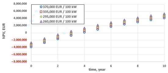 Regardless of the achieved technical minimum, the variant with the lowest technical minimum yielded decidedly the best result for the same power of plasma torch (Figure 3)—a positive NPV was reached already in the second year after the investment for the least lucrative variant (technical minimum of 50%). This is due to the fact that in the case of the lowest technical minimum, the same level of outlays in the zero year brings in the largest revenues from the capacity market. For the same investment outlays (Y = 0) the stream of revenues is the deciding factor.