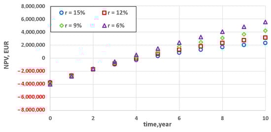 The result of the analysis is relatively easy to interpret. When the result is greater than or equal to zero (NPV ≥ 0), the project should be realized since it meets the investor’s expectations []. Otherwise, from the investor’s point of view, the realization of the project in the considered time horizon is unprofitable.