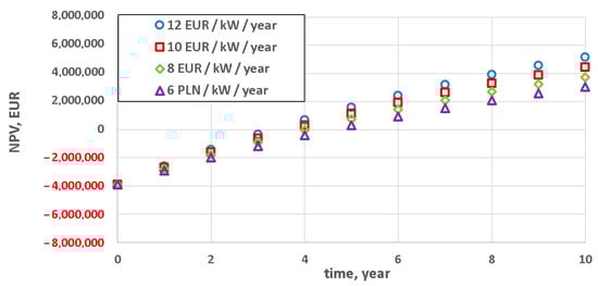 Figure 8 shows the effect of the expected return rate on project NPV. For the considered case (the power unit technical minimum amounting to 30% of the rated power, Y = 1) the project becomes profitable (NPV > 0) two years earlier when the expected rate of return is changed from 15% to 6%. In the considered 10 year investment horizon, the project can be regarded as economically viable even if a return rate of 15% is assumed. The effect of the price of 1 kW obtainable at capacity market auctions on project NPV is shown in Figure 9. This effect is considerable within the assumed 10 year investment horizon.