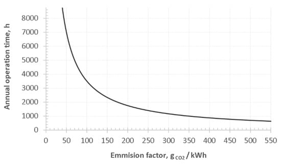 Non-technical risks should not be overlooked in any decision process when an investment is to be made in the energy sector. This is especially true for system power plants, which are supposed to be responsible for the security of energy supply. One of the non-technical risks is the possibility to be excluded from participation in the capacity mechanisms. In the European Union, only units that emit 550 g of CO2 of fossil fuel origin per kWh of electricity can take part in the capacity market []. Moreover, such units cannot emit more than 350 kg of CO2 of fossil fuel origin on average per year per 1 kWel of installed power []. Both limits are calculated based on net efficiency at nominal capacity under the relevant standards provided for by the International Organization for Standardization []. A simple calculation shows that a unit with an emission of 550 g of CO2 of fossil fuel origin per kWh of electricity can operate for a maximum of 636 h per year. Consequently, an emission factor lower than 44 g of CO2 of fossil fuel origin per kWh of electricity is needed to operate for approximately 8000 h per year (Figure 10).