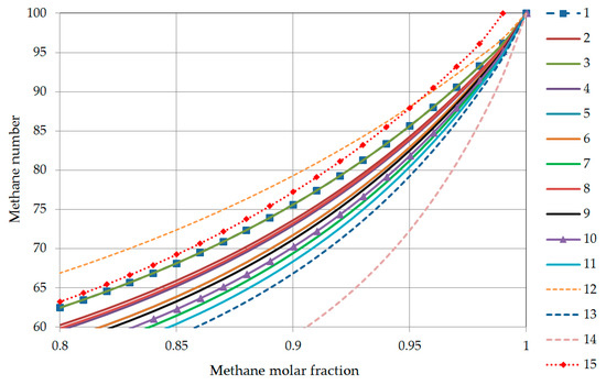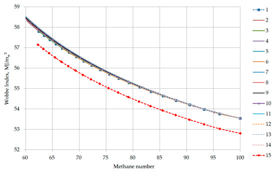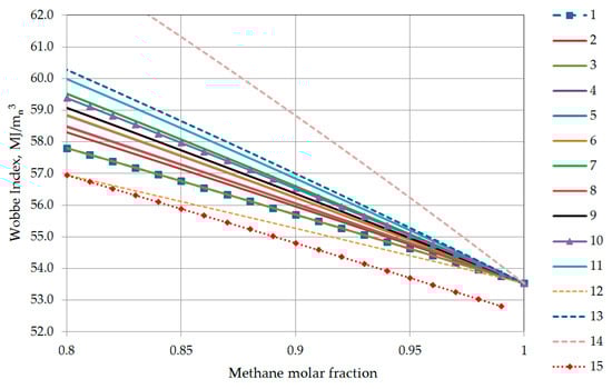In the performed analysis, the relation of the methane number was referred to the upper Wobbe Index as the main quality parameter of natural gas. Figure 9 shows the dependence of the Wobbe Index on the molar fraction of methane for fifteen tested sets of natural gas compositions. The Wobbe Index increases with a decrease in the molar fraction of methane and with an increase in the molar fraction of heavier hydrocarbons. For composition sets containing pentane and butanes, the increase in Wobbe Index is higher. It is clearly presented for the binary mixture methane-butanes (Set 14), where the butanes content increase more rapidly.