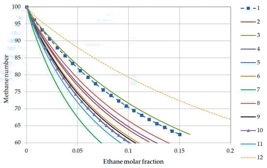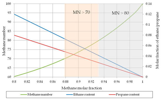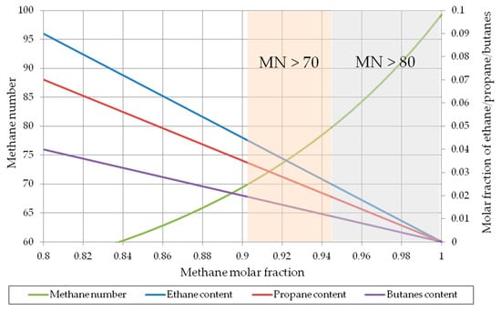 The current world trends related to maximizing the engine energy efficiency and limiting emissions into the natural environment increase the probability of tightening the methane number criteria for internal combustion engines. The first proposals to tighten these requirements appeared already in 2011 and were submitted by the European Commission and the European association of engine manufacturers Euromot [34]. After considering methane number as a gas quality parameter, the proposal (Euromot) specified that the value of methane number should be as high as possible in order to avoid incorrect operation of internal combustion engines and increase their efficiency. Euromot recommends in its proposal that the methane number of natural gas as engine fuel should not be lower than 80.
