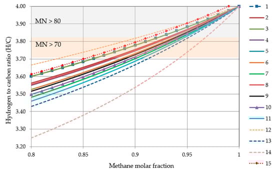 H/C ratio is defined by the ratio of the hydrogen atoms number to carbon atoms number in a given molecule. For example, for methane it is H/C = 4, for ethane it is H/C = 3, etc. The situation becomes more complicated when a mixture of hydrocarbons has more components. Figure 1 shows the dependence of the H/C ratio on the molar fraction of methane in a binary mixture with ethane, propane or butanes. The relationship to determine the H/C ratio for multi-component hydrocarbon mixtures is presented in Equation (2):
