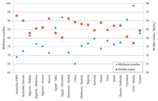 Highly developed engines are designed for MN ≥ 80 so that they can achieve high power, low emissions and excellent fuel economy. Lower methane number values can reduce the economics of gas engine applications but increase greenhouse gas emissions or decrease engine efficiency [25,29]. Considering the above issues, changes in standardization which describes the acceptable limits of methane number for internal combustion engines should be expected in near future. The current standard for natural gas combustion engines is a minimum methane number of 70 (DIN 51,624 standard). This requirement is fulfilled by liquefied natural gases from most of the world’s sources (except Australia, Libya–similarly to the Wobbe index criterion).