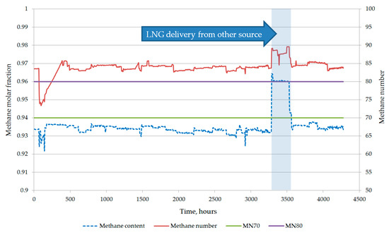 Analysis of compositions of liquefied natural gas available from world exporters, showed that LNG from most sources achieved the criterion of methane number higher than 70 (among the analyzed sources, only LNG from Libya and Australia NWS had methane numbers lower than 70) [20]. In the case of tightening the methane number criterion to 80, the number of LNG sources for which the composition achieves this criterion decreases significantly (Figure 11).