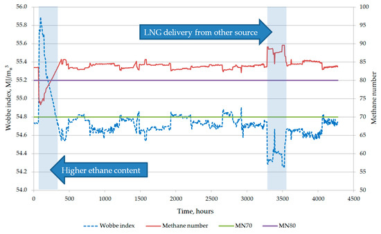 In analyzed operational data from the LNG storage terminal, a decrease in the methane value was also observed, which was caused by the increased content of ethane in the LNG composition. The increased molar fraction of ethane is reflected in the higher Wobbe Index value. Observing the curves describing the the methane number and Wobbe Index values it should be noted that they are approximately a mirror reflection of each other (Figure 13). The increase in methane content observed during LNG delivery from other source reduces the Wobbe Index.