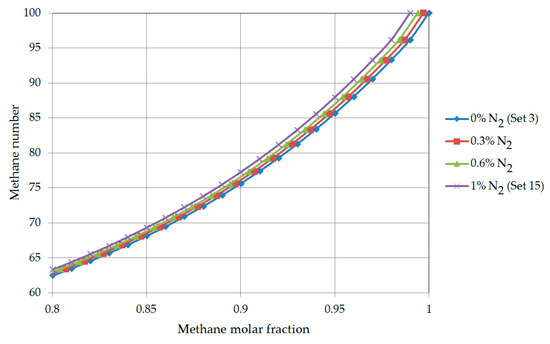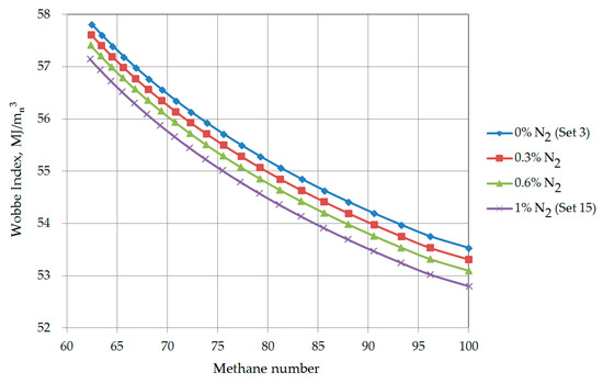 Impact of nitrogen on the natural gas quality parameters was analyzed for selected compositions (set 3–0% nitrogen and set 15–1% nitrogen) and intermediate variants with the molar fraction of nitrogen 0.3% and 0.6%, the contents of other hydrocarbons change analogously as for sets 3 and 15. Nitrogen content increase in the LNG composition to 1% causes an increase in the methane number value as a function of methane molar fraction (Figure 14). This change occurs due to the fact that nitrogen as a part of the system does not reduce the ratio of hydrogen atoms to carbon atoms (H/C). The Wobbe Index for the assumed value of methane number decreases by about 0.7 MJ/mn3 due to nitrogen content increase to 1 mol% (Figure 15).