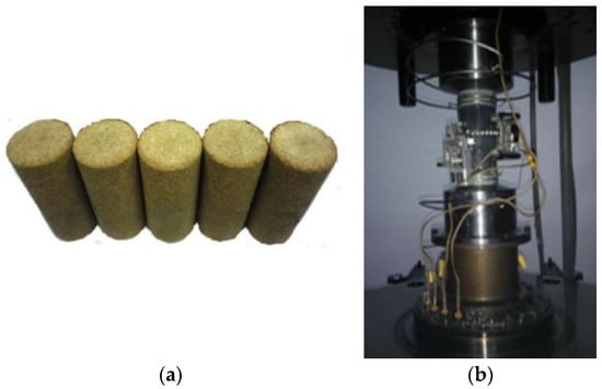 An MTS electro-hydraulic servo triaxial rock testing machine was used in the test and the machining precision of the samples conformed to the test requirements of rock mechanics. Considering the complexity and inhomogeneity of rock properties, to ensure uniformity and comparability of specimens, all specimens were sampled from adjacent positions within the same rock block. An image of sandstone samples and the triaxial cell are shown in Figure 1.