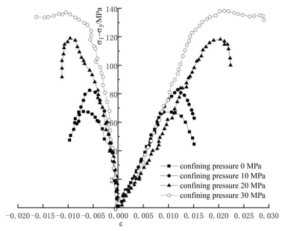 Stress–strain curves of sandstone during deformation under conventional triaxial compression.