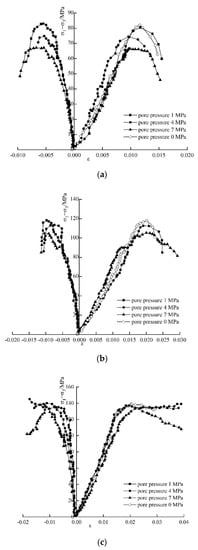 Stress–strain curves of sandstone during failure under hydro-mechanical coupling (a) Confining pressure 10 MPa, (b) Confining pressure 20 MPa, (c) Confining pressure 30 MPa.