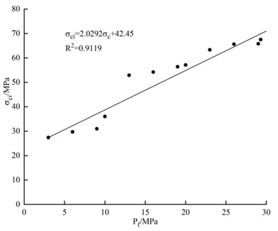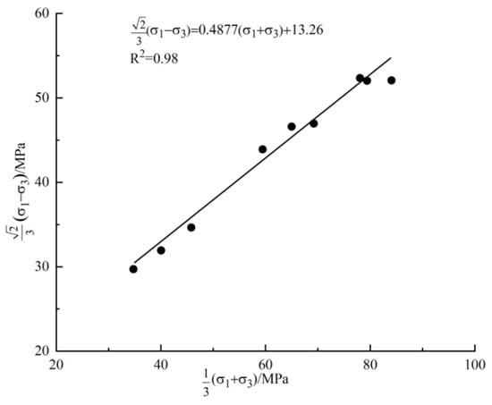 According to Formula (2), the data in Table 2 are fitted, as shown in Figure 7, thus obtaining the angle of internal friction of 31.2° and a cohesion of 16.4 MPa.
