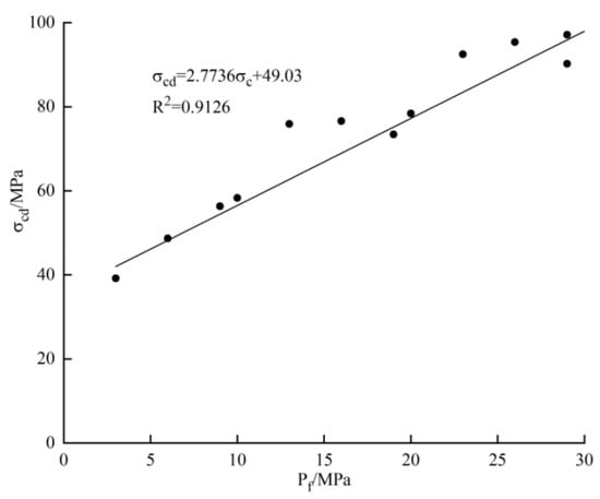 where, and ΔP represent the confining pressure in the test and the seepage pressure, respectively. The characteristic stresses on sandstone under different effective confining pressures are listed in Table 2 and the relationship between characteristic stress and effective confining pressure is demonstrated in Figure 5 and Figure 6.