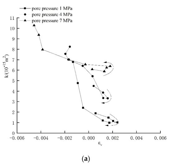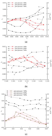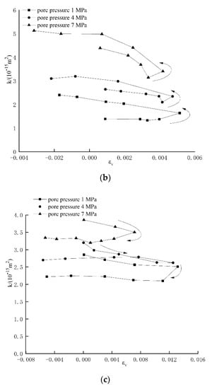 Relationship between permeability and volumetric strain of sandstone under different seepage pressures. (a) Pore pressure 1 MPa; (b) pore pressure 4 MPa; (c) pore pressure 7 MPa.