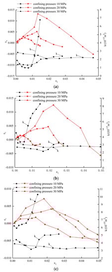 Volumetric strain, axial strain and permeability, axial strain of sandstone under different confining pressures. (a) Confining pressure 10 MPa; (b) confining pressure 20 MPa; (c) confining pressure 30 MPa.