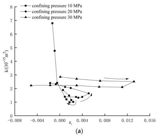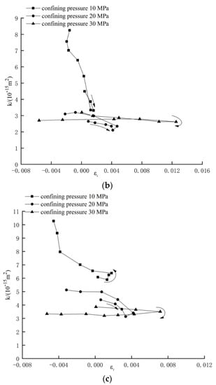Relationship between permeability and volumetric strain of sandstone under different confining pressures. (a) Confining pressure 10 MPa; (b) confining pressure 20 MPa; (c) confining pressure 30 MPa.