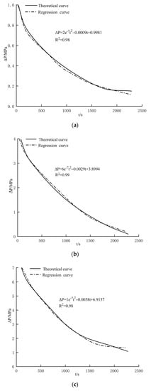 The seepage velocities V1, V2, …,·Vn at different times can be acquired based on piston displacement. By fitting seepage velocities and pressure gradients, the following formulae were obtained [38]: