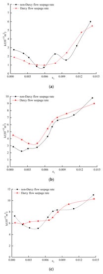 At present, in most seepage–stress coupling tests of a rock mass, the axial stress is increased under certain confining pressures and water pressures and changes of permeability during deformation are measured on the premise of Darcy flow. The research objects include coal and rock masses, sandstone, salt rock, granite, etc. Yu et al. [11] and Jiang et al. [12] considered that change of permeability are commonly determined by microfracture initiation and propagation in rock and crushing of skeleton particles therein. Wang et al. [4], Liu, et al. [5], Oda et al. [13], Mitchell et al. [14] analyzed changes to the permeability during crack propagation in granite, where seepage only occurs after the onset of cracking. Alkan [15] explored the corresponding relationship between change of permeability in salt rock and acoustic emission information, finding that the acoustic emission event concentration occurred in the area of variation of permeability. Nara et al. [16] investigated changes in wave velocity during permeability evolution in basalt. Moreover, Pereira et al. [17] researched the effect of fracture distribution on permeability. They all found that the permeability of intact rocks was very low and increased only when cracks appeared. Liu et al. [18] studied the correspondence between creep deformation of mudstone and pore pressure and found the permeability evolution could be determined by the microstructural evolution of rock. Li et al. [19] found that axial strain (in a rock specimen) has a functional relationship with permeability. Pradip et al. [20] and Legrand et al. [21] investigated the rate of convergence under stable seepage in crushed rock and pressure-drop data during seepage and used a capillary model to predict the experimental data expressed in terms of a pore friction factor. In the test results of rock failure under hydraulic coupling, there are few complete datasets relating to volumetric strain and circumferential strain and the correlations of coefficient of permeability with hydraulic gradient and volumetric strain remain unclear.