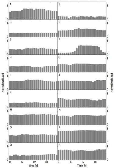 Hourly average of normalized load profile. The industries referred to by the labels (A–R) are given in Table 3.