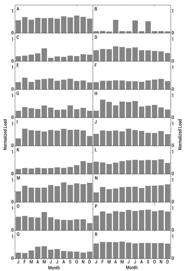 Monthly average of normalized load profile. The industries referred to by the labels (A–R) are given in Table 3.