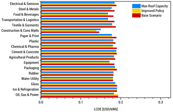 Most of the sub-industries have an optimized LCOE of around USD 0.17/kWh to USD 0.186/kWh, while only the Oil and Gas sub-industry has exceeded the average electricity retail price of ~USD 0.19/kWh. Sub-industries with low energy intensities (Construction and Construction Materials, Transportation and Logistics, and Food and Beverages) generally exhibited a lower optimized LCOE. Meanwhile, energy intensive sub-industries (Electrical and Semiconductors, Cement and Concrete, Steel and Metal, and Textile and Garments) accounted for higher NPV and lower CO2 emissions as these parameters are directly influenced by electricity demand and, hence, the larger effect of rooftop solar PV installation. This demonstrates the effect of a facility’s energy consumption on the LCOE, NPV, and CO2 reduction upon the integration of rooftop solar PV.
