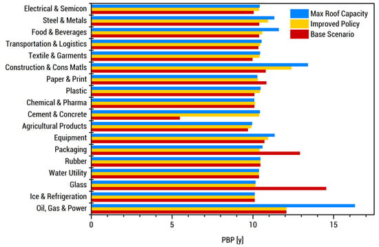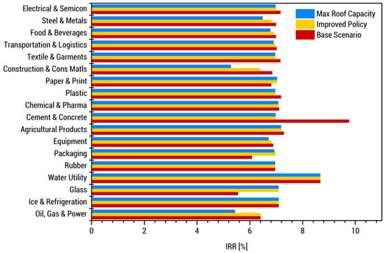 The IRR values of the additional sub-industries considered in this work averaged 6%–7%, which is slightly lower than the IRR of those considered in our previous work. Nonetheless, this is still higher than the 4% interest rate in 2019 [28], indicating minimal investment risk upon the deployment of rooftop solar PV. This is particularly true for energy intensive sub-industries, which are characterized by high IRR and low PBP values. In contrast, sub-industries with a low energy consumption had a higher PBP and an IRR near the 4% interest rate.