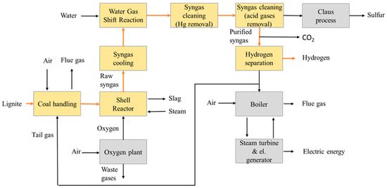As mentioned before, the gasification process in a shell reactor was chosen for analysis (Figure 1). To the best of our knowledge, the selected technology is among the most popular worldwide; it is characterized by high efficiency and technological maturity. In shell technology, coal is initially dried by tail gas (remaining after hydrogen separation from syngas) to 5% in the case of hard coal or 12% in the case of lignite. Dried coal is fed into the dispersive reactor, with a supply of fuel in dry conditions in which, at a temperature of 1430 °C and pressure of 4.2 MPa, the gasification process takes place. Purified synthesis gas (syngas), from which 99.9% of solid particles, 90% of chlorides and all the alkaline compounds have been removed, goes to a water gas shift (WGS) reactor (in that process, carbon monoxide, in reaction with steam generated in the gas cooling process, is converted to CO2). After conversion, the synthesis gas is cooled to about 35 °C and purified in a Selexol unit from coal oxysulfide, mercury and acid gases, including hydrogen sulfide, with an efficiency of 99.9%, and from carbon dioxide, with an efficiency of 90%. In the case of installations provided with a CCS system, the separated carbon dioxide is compressed and subsequently pumped underground via a pipeline system and ultimately stored. The remaining gas is combusted in a boiler, providing the heat necessary to generate steam. The steam is used for driving the turbine coupled with a generator of electric energy, and it is entirely used for internal consumption, which amounts to 33.1 MW in the case of the gasification of hard coal and 34.6 MW for lignite (higher energy consumption is associated with the coal handling process). In the case of installations equipped with a CCS system, the electricity consumption for both coals amounts to 51.6 MW and 53.4 MW, respectively) [44].