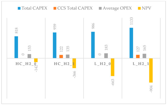 The assessment of the economic efficiency of the analyzed technologies focused upon the expenditures and costs of key technological processes and income components corresponding to hydrogen sale. Capital expenditures were calculated at the level of total plant cost (TPC), and after taking into account other overheads and provisions (demand for working capital and materials and chemicals in the start-up phase, as well as provisioning, amounting to 15% of TPC as total capital expenditures; TASC).