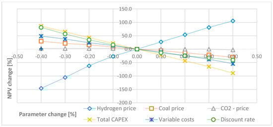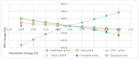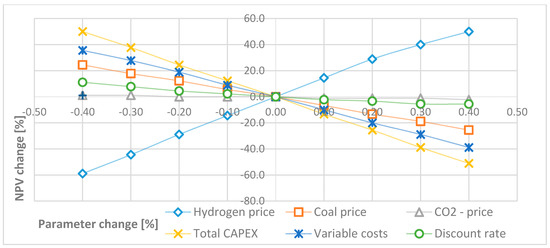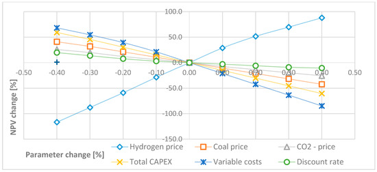 Table 10, in turn, presents the sensitivity analysis concerning the variant of hard coal gasification with CCS systems. The discussed technology would achieve a positive NPV only if the prices of hydrogen increase by at least 40%. A change of other input variables in the range of ±40% would not result in the NPV turning positive. In the case of variants concerning the gasification of lignite (Table 11 and Table 12), the NPV is negative in the entire range of input values, which entails that a change of any of the parameters analyzed would not improve their negative economic evaluation.