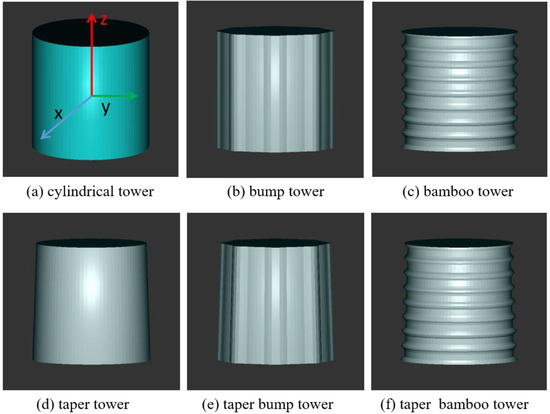 In order to save costs, all the experiments were carried out using a simulation program. We used the geometric modelling methods presented in Section 2 to construct virtual wind turbine towers, including a cylindrical tower, a bump tower, a bamboo tower, a taper tower, a taper bump tower, and a taper bamboo tower. The origin of the world coordinate system is located at the tower centers, as shown in Figure 1a. To speed up the computations, the tower height was truncated to six meters. Initial geometrical parameters of the reshaping procedures are listed in Table 1. The radii of the towers were 1.5 m. The taper ratios of the taper tower, the taper bump tower, and the bamboo tower are 0.4/60. Eight bumps were created on the surfaces of the bump tower, the bamboo tower, and the two hybrid towers. The bump height was 0.1 m. These data represent default values of the geometric parameters but may be changed in experiments to enhance specific effects and tower characteristics.