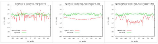 (Left) radar cross-section (RCS) of the bump tower. (Middle) RCS of the taper tower. (Right) RCS of the taper bump tower. RCS of the cylinder tower is rendered in green color and used as the baseline.