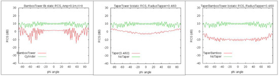 (Left) RCS of the bamboo tower. (Middle) RCS of the taper tower. (Right) RCS of the taper bamboo tower.