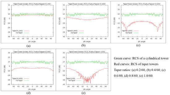 To uncover the relation between taper ratio and RCS, we created five taper towers with taper ratios of 0.2/60, 0.4/60, 0.6/60, 0.8/60, and 1.0/60. Then, we computed their RCS by using the SBR program. The settings of the simulation were the same as those tests in Section 3.1. The results are illustrated in Figure 4. The green curves represent the RCS of the cylinder tower while the red curves show the RCS of these tapered towers. By examining these five results, we found that the higher the taper ratio, the lower the RCS. Therefore, to alleviate radar returns, we should build towers with high taper ratios.