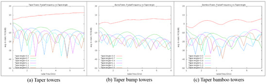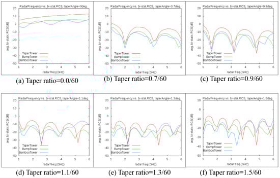 In following tests, we studied the influence of radar frequency on the RCS of towers. At first, we created six taper towers, six taper bump towers, and six taper bamboo towers. The taper ratios of these towers were 0.0/60, 0.7/60, 1.1/60, 1.3/60, and 1.5/60, respectively. Then, we illuminated each tower by using radar waves of six different radar frequencies (1~6 GHz). The average bi-static RCS of the directions, θ = 90° and −20° ≤ ϕ ≤ 20°, were calculated and used as the metrics for comparisons.