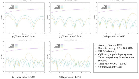 The tests results are plotted in Figure 7. The average bi-static RCS of the cylinder, taper, taper bump, and taper bamboo tower are drawn in purple, green, blue, and yellow color, respectively. For lower taper ratios, 0.4/60 and 0.7/60, the taper bamboo tower is the most effective tower for reducing back scatterings. Nonetheless, as the taper ratio increases, its performance decreases. It generates peak average bi-static RCS at some radar frequencies. For taper ratio equals to 1.0/60, 1.4/60, and 1.8/60, the peak RCS occurs at the radar frequencies of 9.0 GHz, 6.5 GHz, and 5.0 GHz, respectively. We conjecture that the sudden increasing of average bi-static RCS is caused by the coupling effects of radar wavelength, taper ratio, and bump height. In this set of tests, the bump height was 10 cm. The radar frequency, causing peak average bi-static RCS, decreased as the taper ratio increases. A similar phenomenon can be found in the results of Figure 6d–f, though the bump height is shorter, 8 cm, in these simulations. The magnitude of the peak average RCS is smaller.