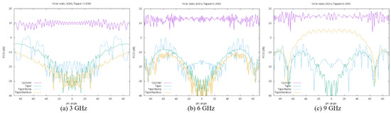 The results are illustrated in Figure 5. The RCS of towers with a 0.0/60 taper ratio is represented by red curves. The RCS of other towers are rendered in green, blue, purple, cyan, and brown colors. In part (a), the test results of the taper towers are displayed. As the image shows, the RCS of the taper tower with a 0.0/60 taper ratio increased along with the radar frequency. On the other hand, the RCS values of other taper towers slightly decreased as the radar frequency increases. Higher frequency radar waves are more similar to light rays than lower frequency radar waves. Scatterings caused by the tapering surfaces become important, and thus more energy of the incident electromagnetic waves is reflected toward insignificant directions.