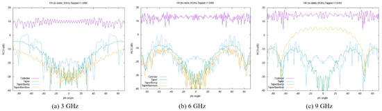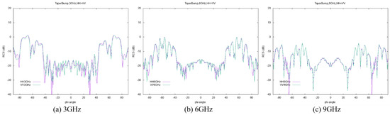The performances of the towers were evaluated by using their bi-static RCS. The bi-static RCS of the HH and VV polarization are shown in Figure 8 and Figure 9. The bi-static RCS of the cylinder, taper, taper bump, and taper bamboo towers are rendered in purple, green, blue, and yellow color, respectively. These figures show that the bi-static RCS under HH and VV polarization are similar, especially for the cylinder, taper, and taper bamboo tower. Only the bi-static RCS of the taper bump tower are affected by the polarization method. To uncover the difference, we draw the HH and VV bi-static RCS of the taper bump tower in Figure 10. The data obtained by using HH- and VV-polarization are shaded in purple and green curves. The RCS of HH-polarization is better than that of the VV-polarization for radar frequencies equal to 3 and 9 GHz. However, the difference is not significant within the major back-scattering directions, .